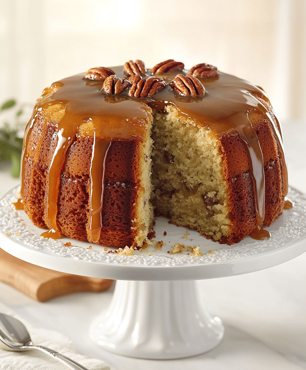 - Glaze the Cake: Let the cake cool slightly, then pour the warm caramel glaze over the top.