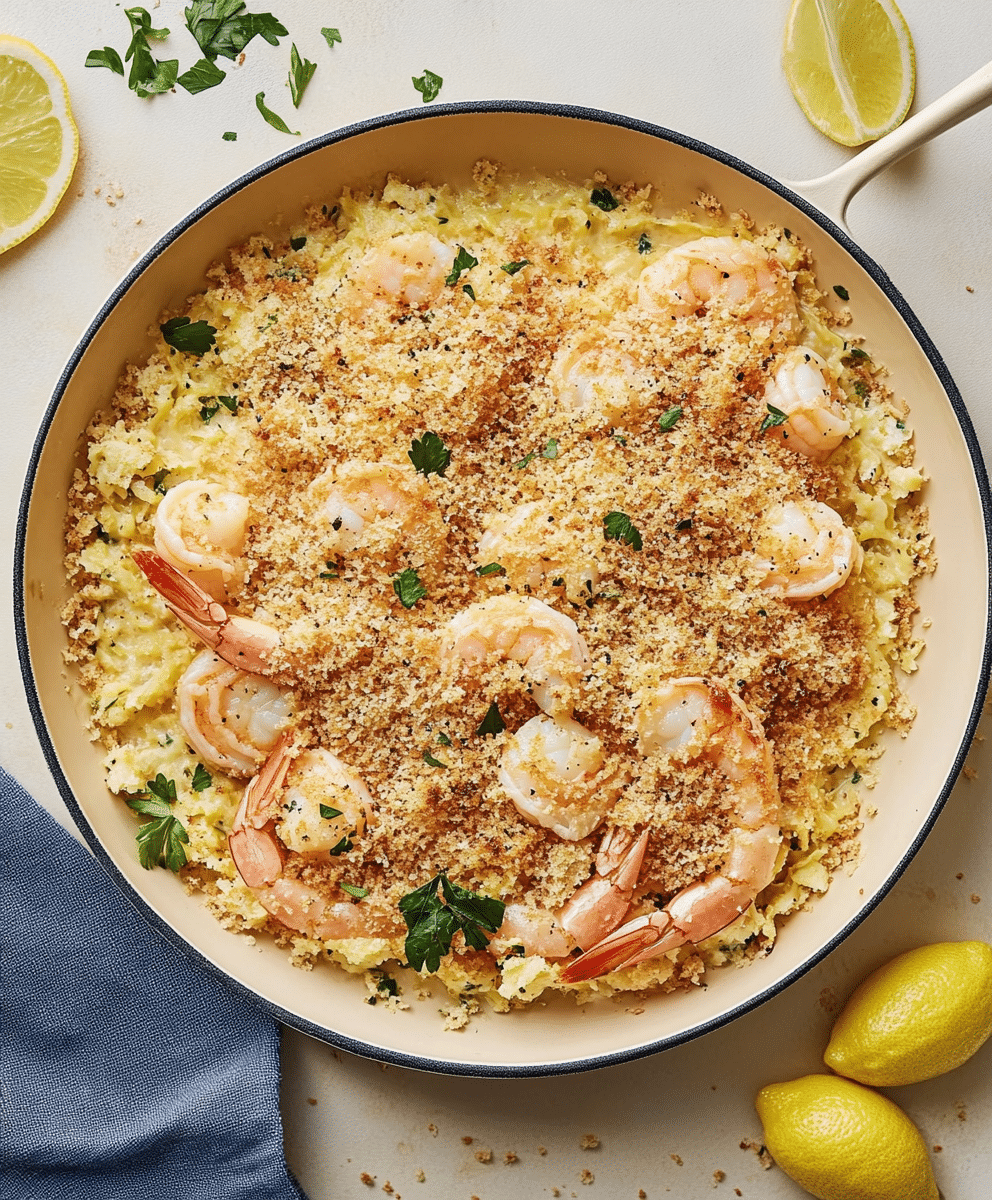 It’s loaded with flavor. Think garlic, lemon, white wine, and butter—classic scampi flavors—elevated by a crunchy, herbed breadcrumb topping that gets beautifully golden in the oven.