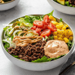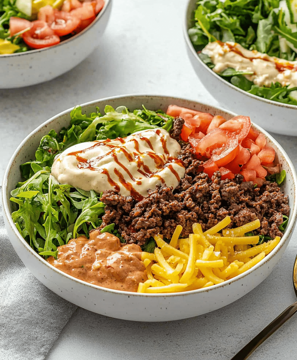 Now you’re ready to assemble! Start with a generous layer of lettuce in each bowl. Spoon the hot ground beef right on top—it’ll slightly wilt the greens in the best way. Then layer on your toppings: pickles, onions, cheese, tomato, avocado, or whatever else your heart desires.