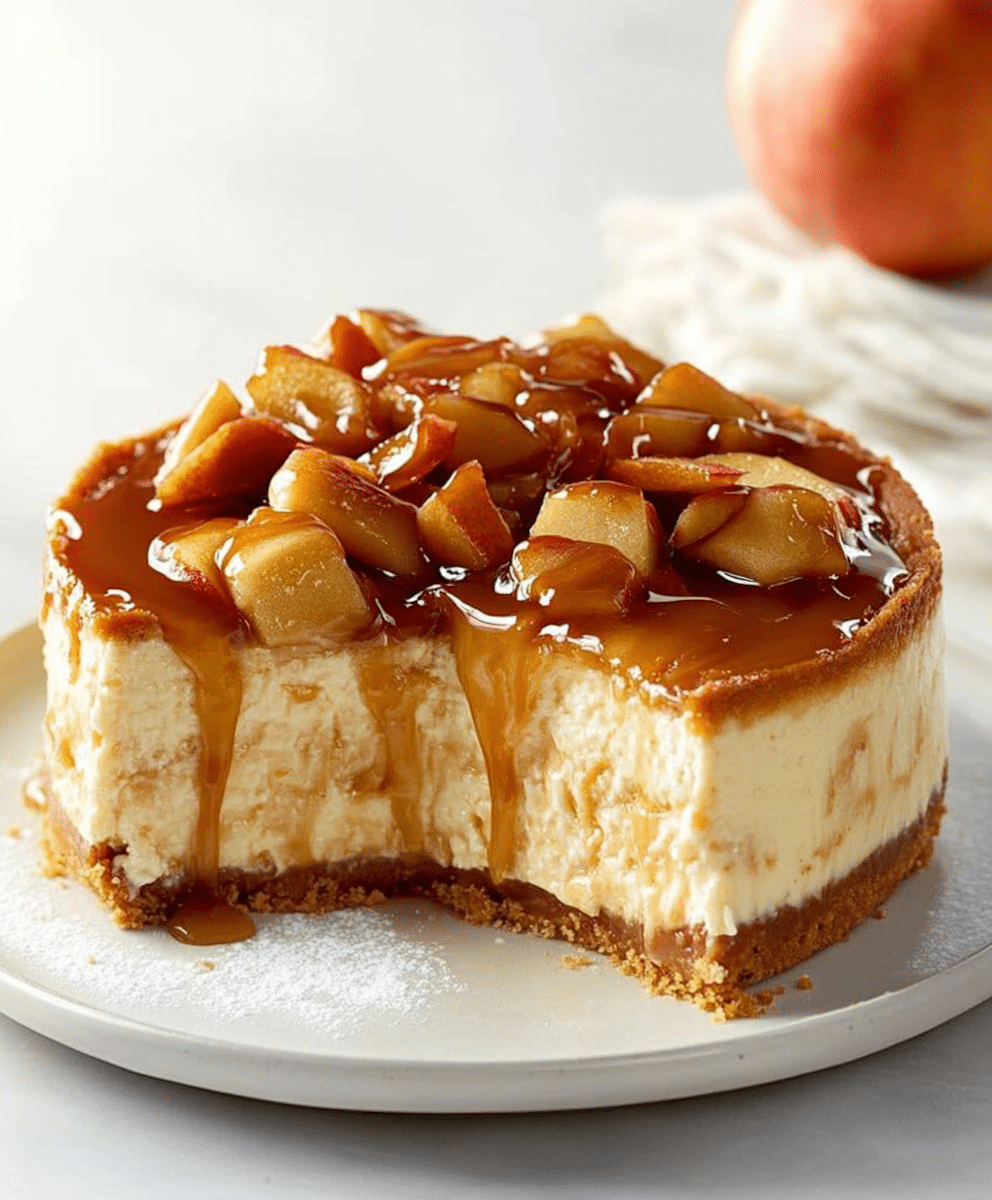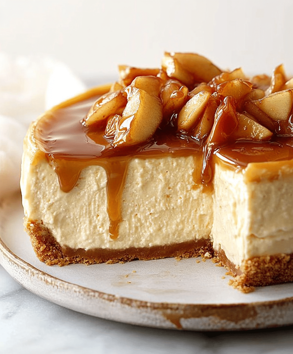 Serve on a decorative cake stand to elevate the presentation. Arrange thin apple slices around the cheesecake for an appealing display. Use edible flowers or mint leaves for a pop of color and freshness.