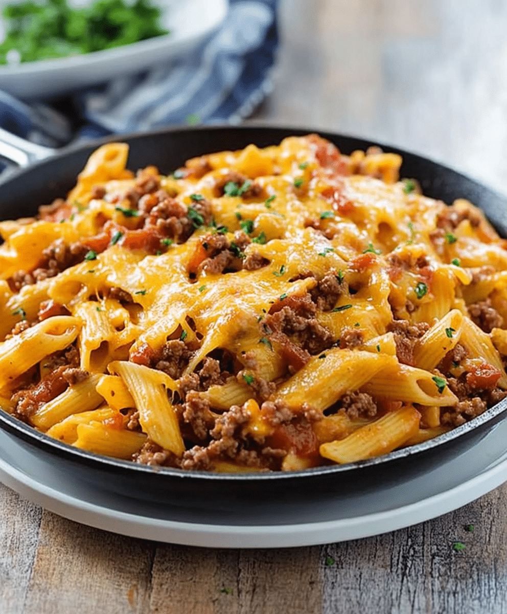 Savor the ultimate comfort food with this Cheesy Ground Beef Pasta Skillet, featuring tender pasta, savory beef, and gooey cheese.
