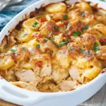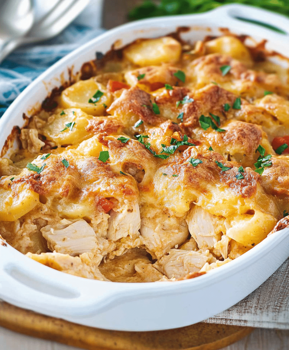 This hearty Chicken and Potato Casserole is a satisfying dish packed with tender chicken, creamy potatoes, and a delicious cheese topping. Ideal for family gatherings, this baked casserole is easy to make with minimal prep. The chicken is seasoned to perfection, and the potatoes absorb all the flavorful juices. Great as a comforting meal with simple, wholesome ingredients.
