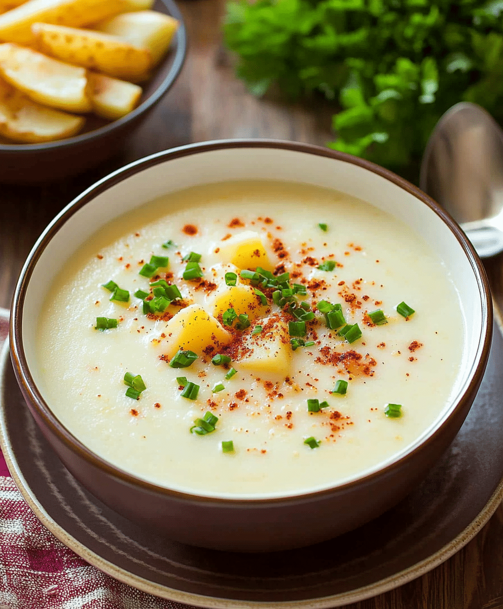 Creamy potato soup is a thick, smooth, and hearty soup made primarily from potatoes, onions, and broth. The creaminess comes from adding milk, cream, or other dairy products, blending everything into a rich, velvety texture. Often flavored with garlic, herbs, and sometimes bacon or cheese, this dish is a versatile comfort food that pairs well with various toppings and sides.