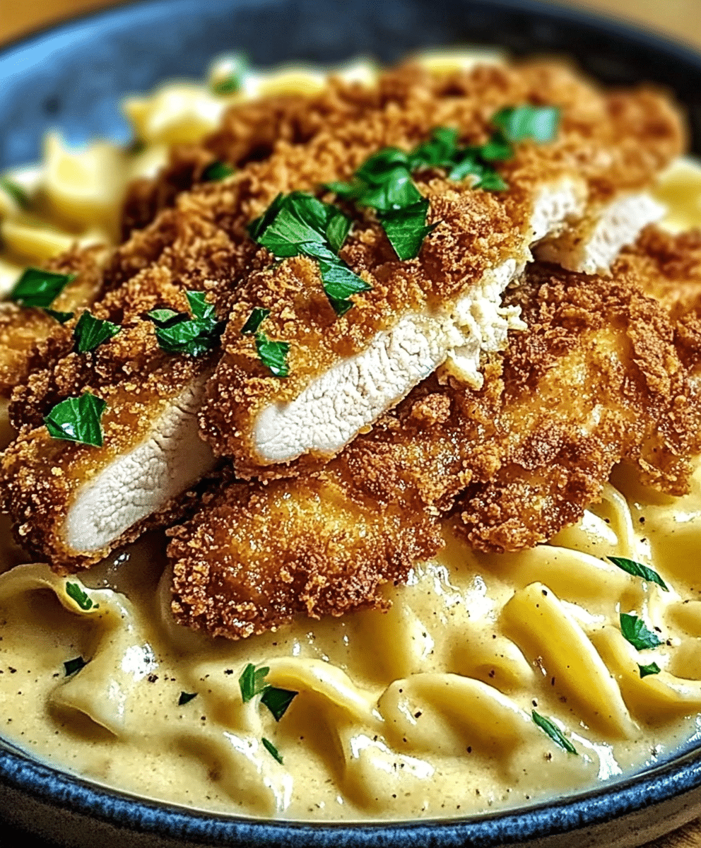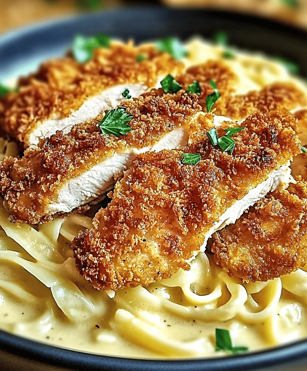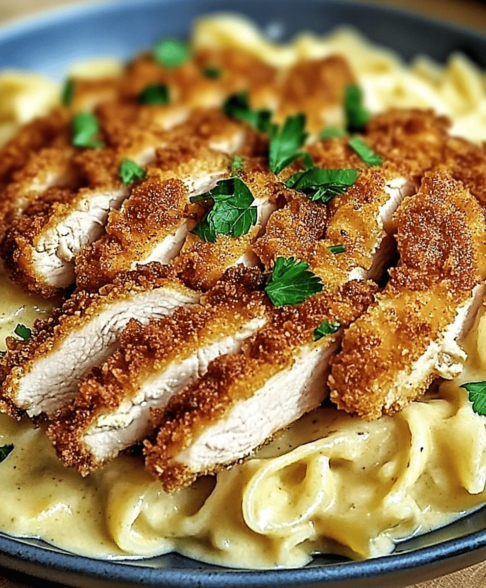 Slice the crispy chicken and serve it over the creamy pasta, garnishing with fresh parsley and extra parmesan for the perfect finishing touch.