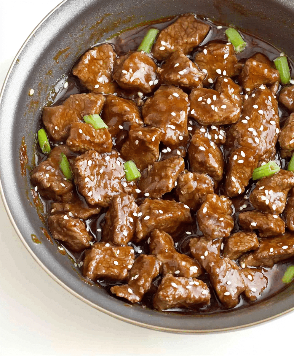 - Return beef to the pan, coat with sauce, and cook for another minute.