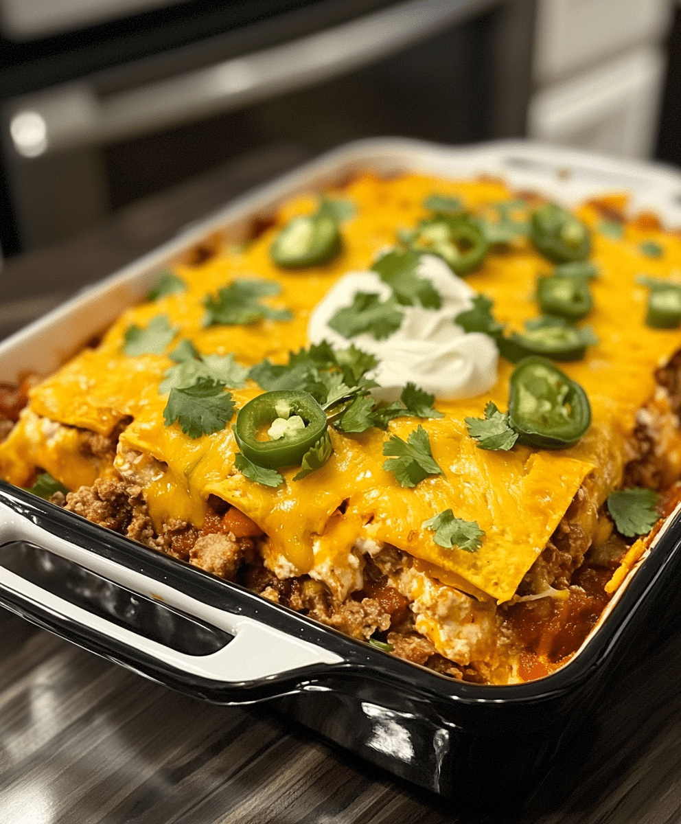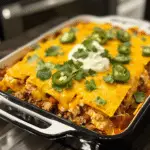 - Layer the Casserole: In a greased 9x13-inch baking dish, start by spreading a thin layer of enchilada sauce on the bottom. Add a layer of tortilla pieces, followed by a layer of the meat and bean mixture. Sprinkle with shredded cheese. Repeat these layers until all the ingredients are used, finishing with a final layer of cheese on top.