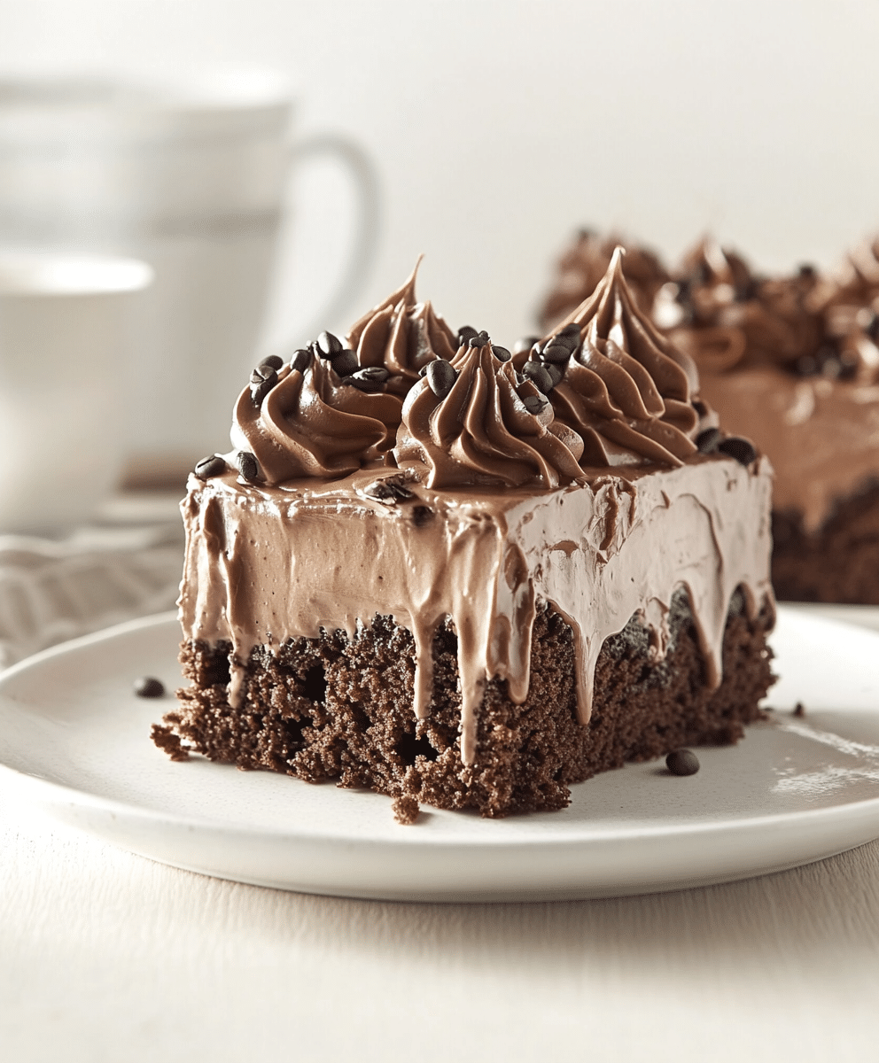 For a café-style experience, serve each slice of mocha poke cake with a side of whipped cream or a dollop of vanilla ice cream. Pair it with a freshly brewed cup of coffee, espresso, or a latte for a dessert pairing that highlights the cake’s rich flavors. This cake also makes a fantastic dessert for potlucks, family gatherings, or holiday celebrations.