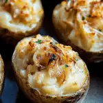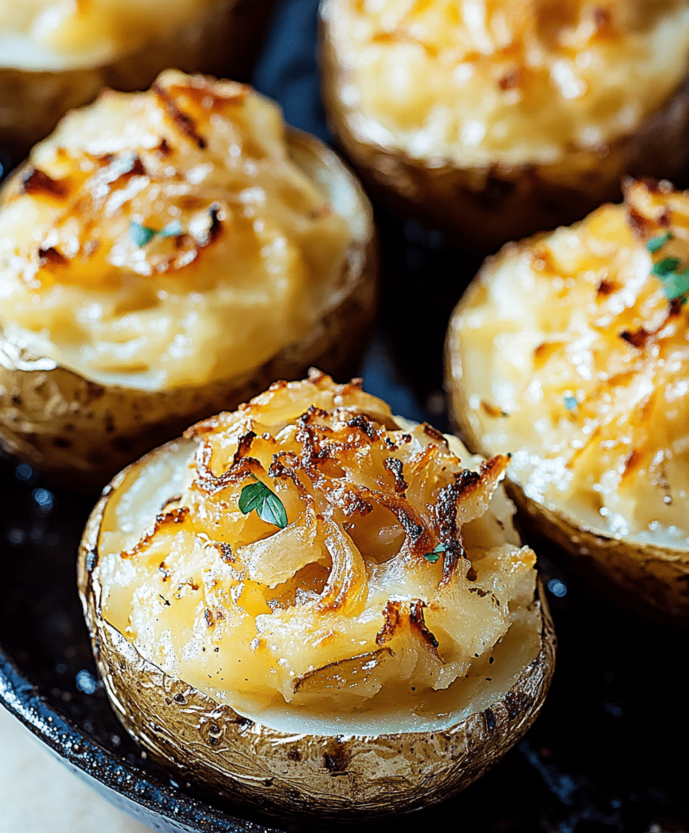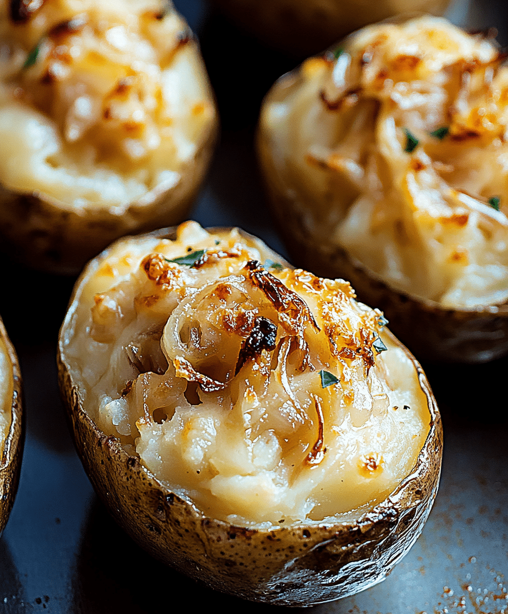French Onion Stuffed Potatoes combine the rich flavors of caramelized onions, melted cheese, and crispy baked potatoes for a comforting, savory dish.