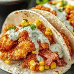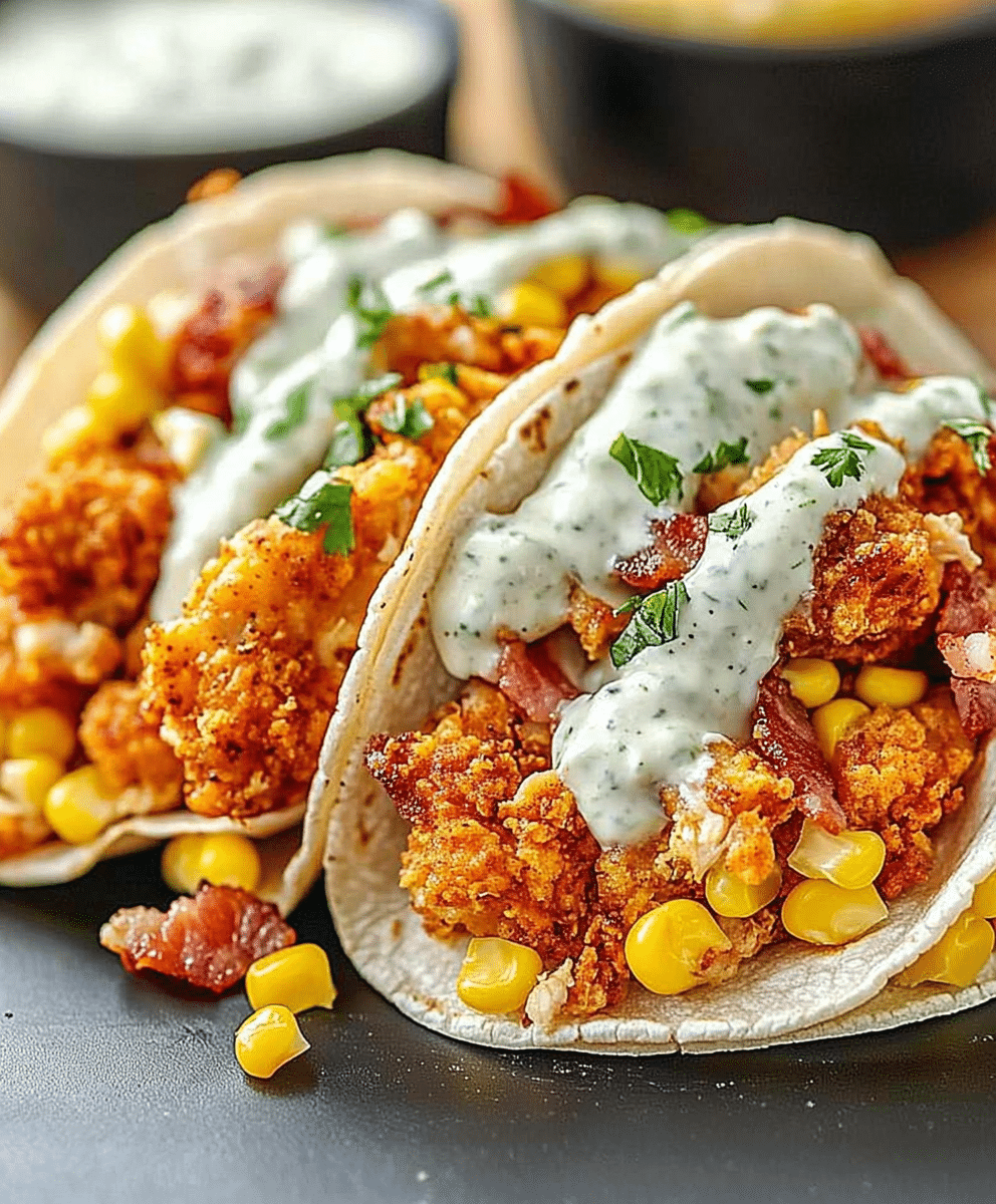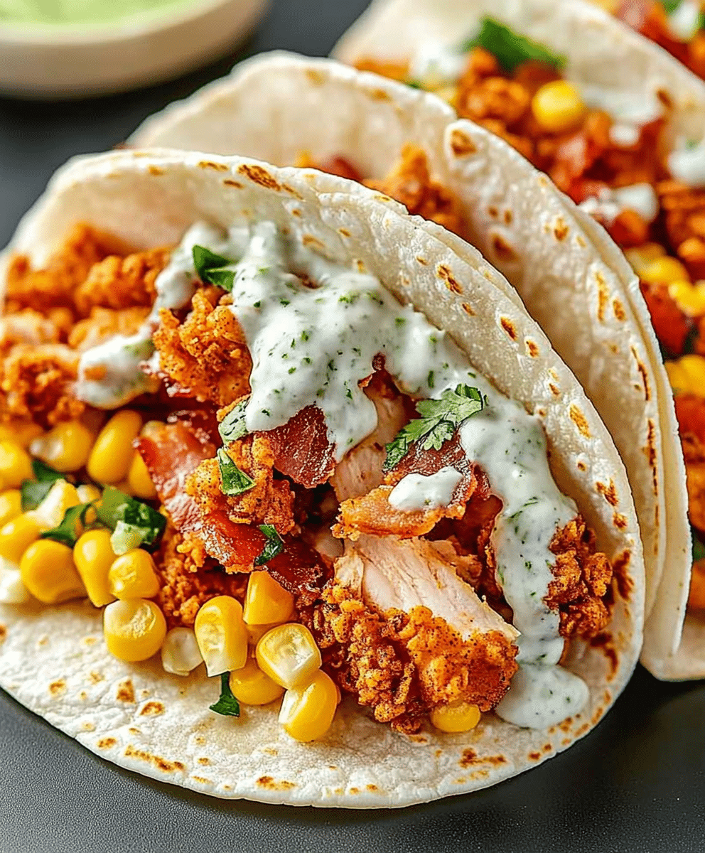 These Fried Chicken Street Corn Tacos with Bacon and Jalapeño Lime Ranch are a flavor-packed twist on classic tacos. Juicy fried chicken is paired with charred street corn, crispy bacon, tangy lime ranch dressing, and a spicy kick from fresh jalapeños. Perfect for taco night, this Tex-Mex recipe is easy to make and bursting with bold flavors!