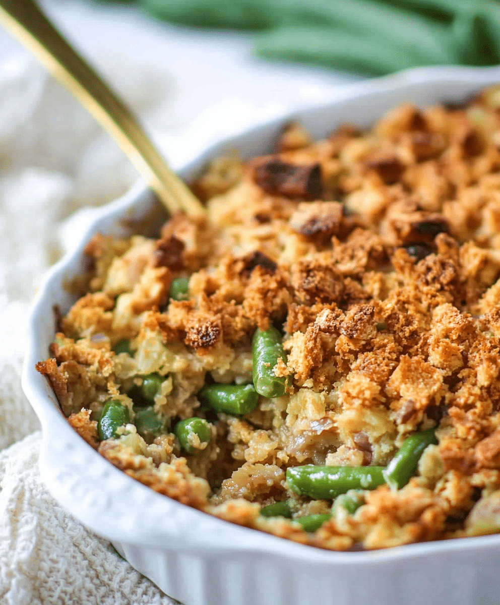 Whether you’re preparing for a holiday feast or a cozy family dinner, this Green Bean Stuffing Casserole will quickly become a favorite. It’s comforting, easy to make, and filled with delicious flavors that everyone will enjoy. Follow the step-by-step guide, experiment with different variations, and avoid common mistakes for the best results. Serve it with pride and watch it disappear from the table in no time! Happy cooking!