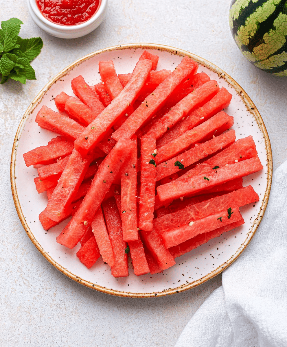 Start by slicing your watermelon into rounds, then into thick slices. From there, trim those slices into fry-sized sticks – think long, rectangular strips about the size of a traditional French fry. Pat them dry slightly with a paper towel so they’re easier to pick up and dip.