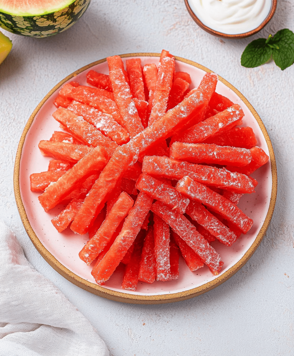 These watermelon fries are best enjoyed fresh, but you can absolutely prep them a little in advance. Store the cut watermelon fries in an airtight container in the fridge for up to 2 days. Just be sure to drain any excess juice before serving to keep them crisp.