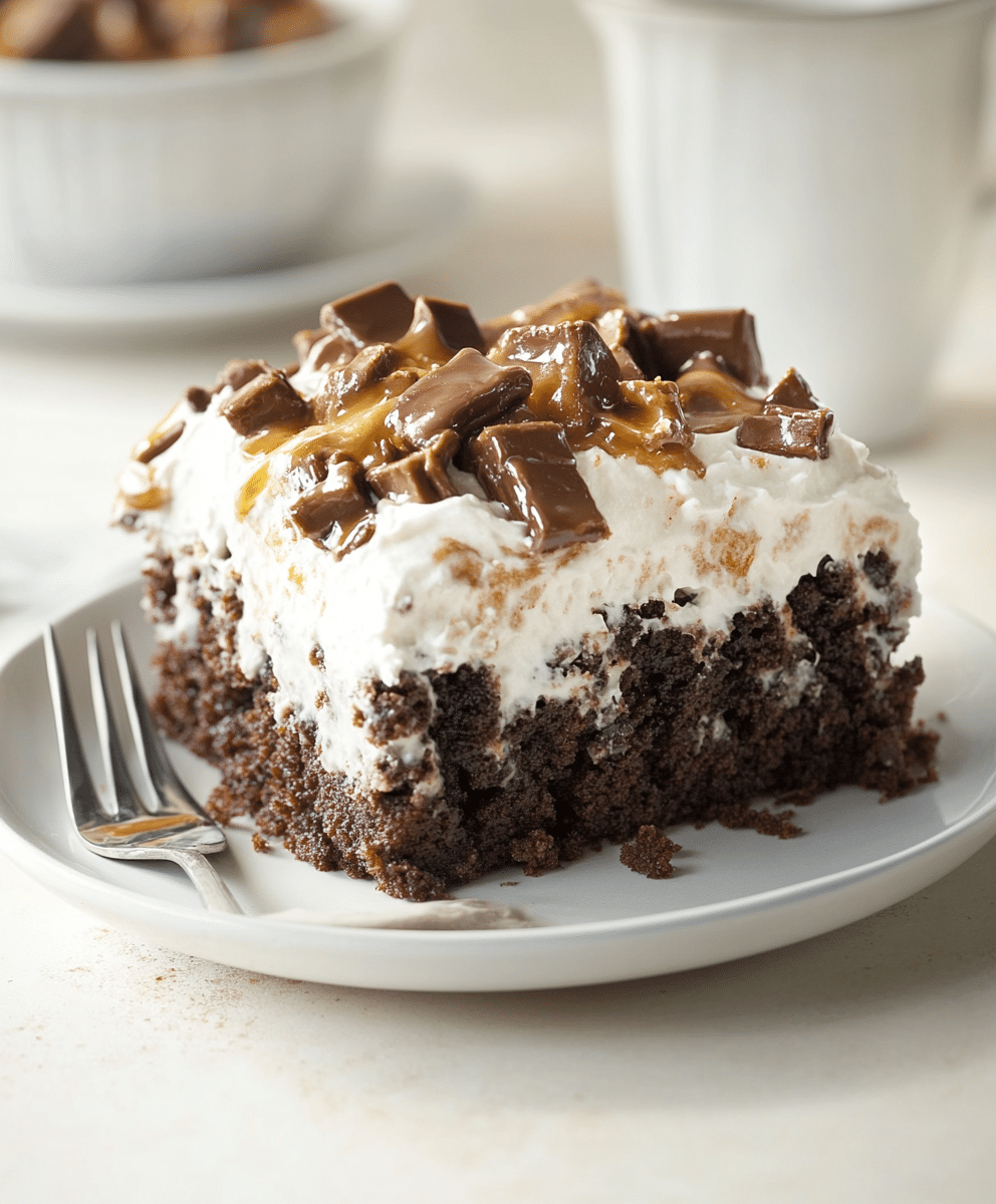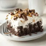 Heath Bar Poke Cake combines moist chocolate cake, caramel sauce, and crunchy Heath Bar pieces for a deliciously indulgent dessert. This decadent cake recipe is easy to make, loaded with sweet toppings, and perfect for sharing at parties or potlucks.