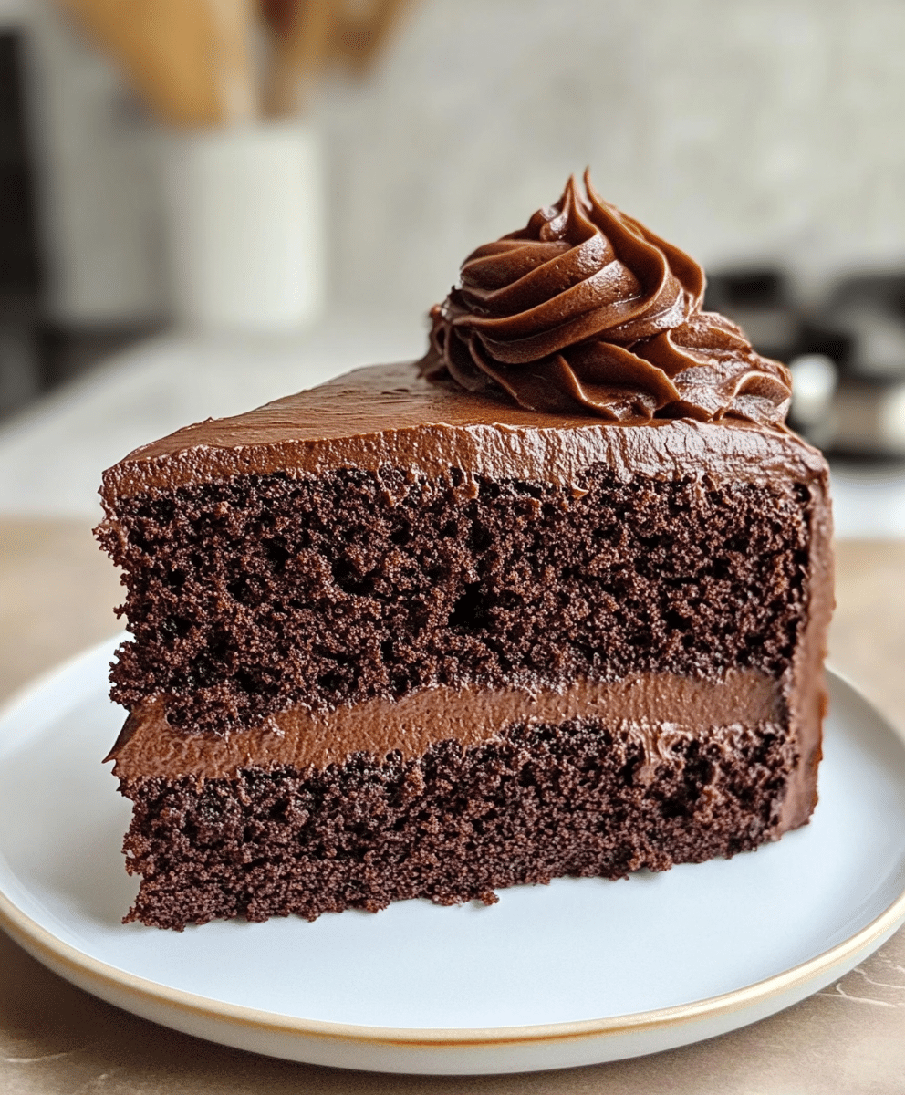 For the best flavor, serve your homemade chocolate cake at room temperature. If you’ve stored it in the refrigerator, allow it to sit out for 30 minutes before serving. Cut into slices with a sharp, serrated knife for clean cuts, and serve each slice with an optional garnish like whipped cream or fresh fruit.