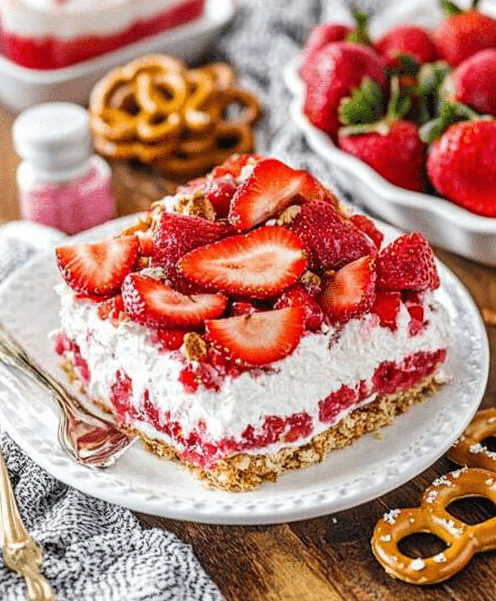 Judy’s Strawberry Pretzel Salad is a classic layered dessert featuring a salty pretzel crust, sweet cream cheese filling, and fresh strawberry gelatin topping. It’s the perfect mix of textures and flavors, ideal for potlucks, holidays, and summer parties.