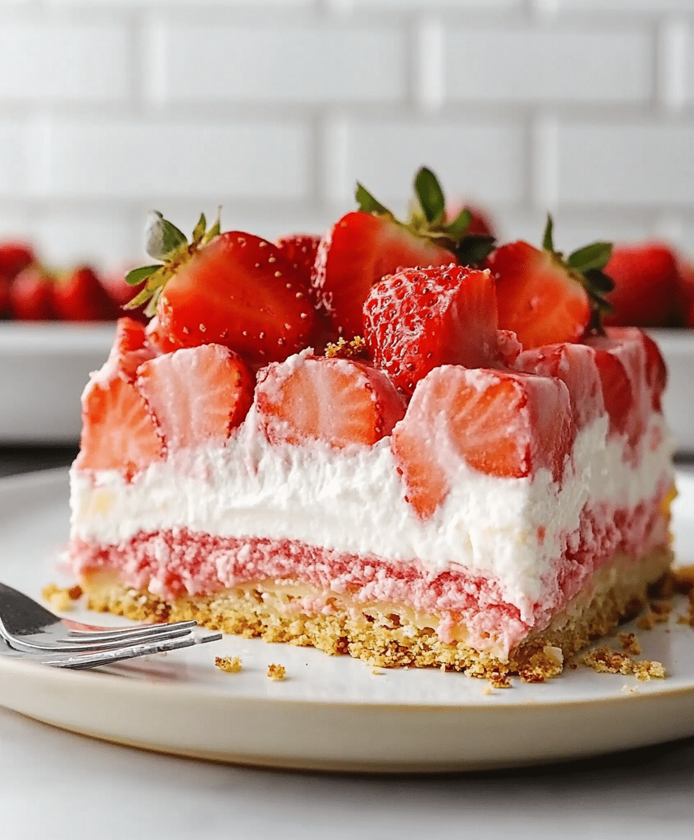 Layered Strawberry Cheesecake Lasagna is a no-bake dessert made with layers of graham crackers, creamy cheesecake filling, and fresh strawberries. Perfect for strawberry lovers!
