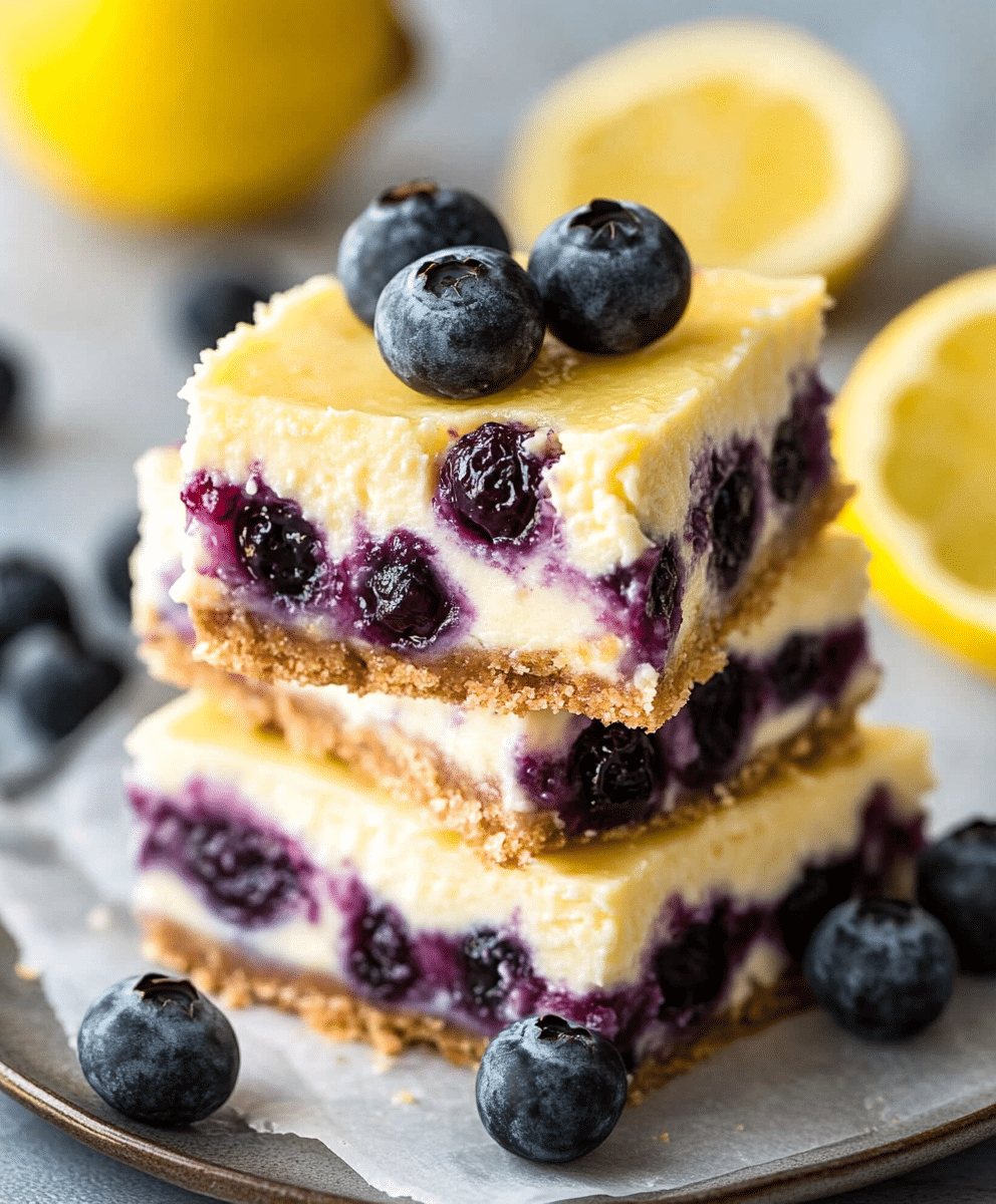These lemon blueberry cheesecake bars combine fresh blueberries, zesty lemon, and a creamy cheesecake layer on a buttery graham cracker crust. The perfect dessert for summer gatherings, offering a balance of sweetness and tanginess.