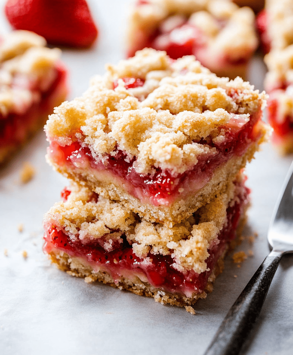 Lemon Strawberry Crumb Bars are delightful dessert bars made with layers of buttery, crumbly dough, a tangy lemon-strawberry filling, and a crumb topping that is golden and crisp. Imagine biting into a buttery shortbread base, with a juicy, jammy middle made from fresh strawberries and lemon zest, all topped with a crunchy crumble layer. They're sweet, refreshing, and incredibly easy to make — perfect for any occasion.