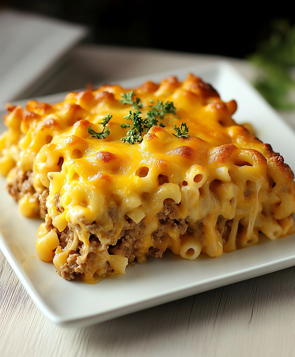 "Mac and Cheese Meatloaf Casserole" is a comfort food fusion dish that combines two beloved favorites—macaroni and cheese, and meatloaf—into one satisfying and hearty meal. The meatloaf base is made from seasoned ground meat, while the top layer consists of creamy macaroni and cheese. This combination creates a delightful contrast of flavors and textures: the savory, juicy meatloaf pairs beautifully with the rich, cheesy pasta. The dish is then baked to perfection, with a crispy golden crust that adds a finishing touch to this ultimate comfort casserole.