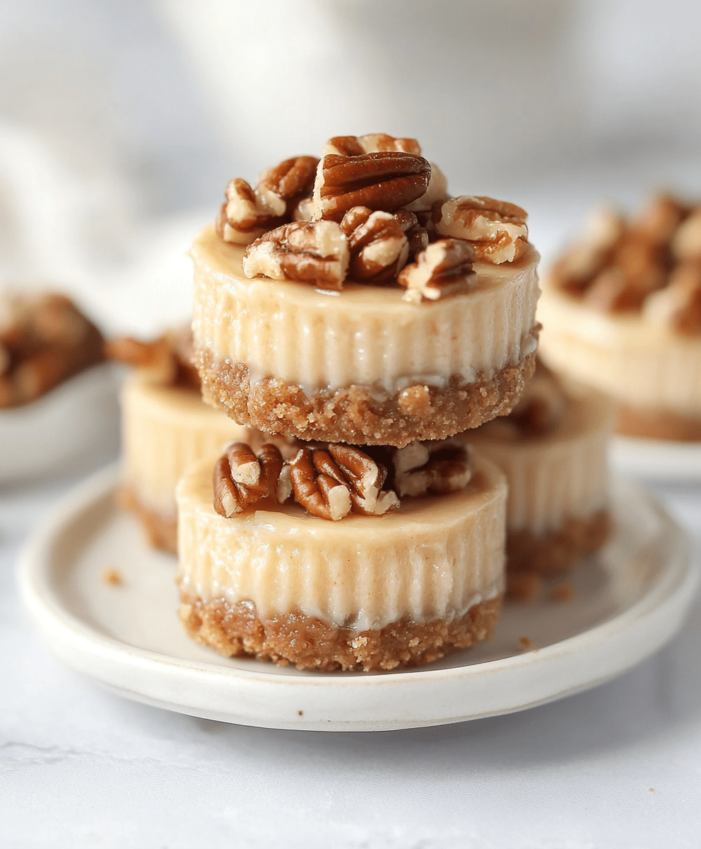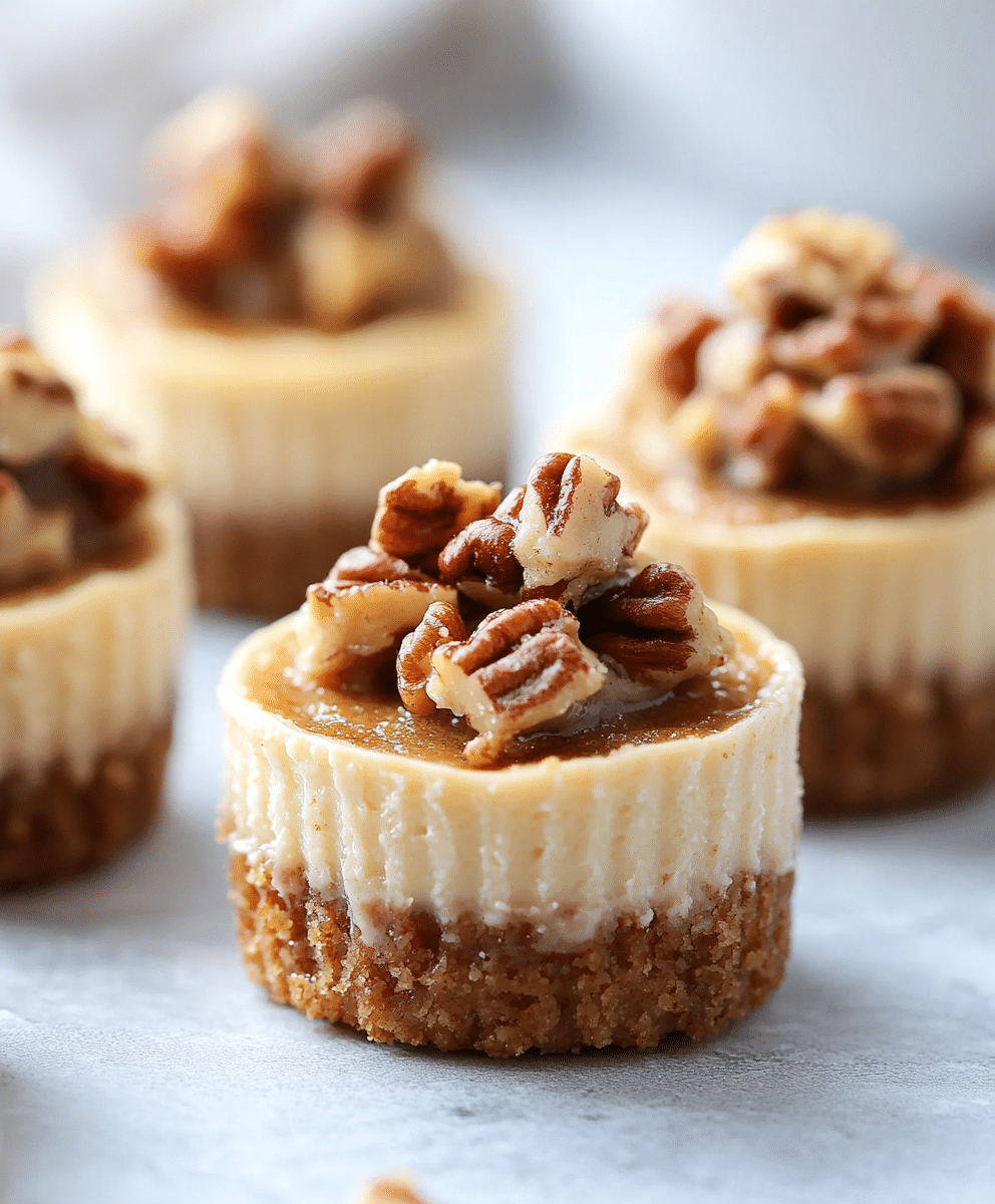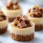 - Garnish: To elevate the look, top each mini cheesecake with a single whole pecan or a light dusting of powdered sugar. You can also drizzle them with a bit of caramel sauce for an extra touch of indulgence.