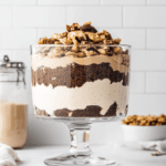 A Peanut Butter Fudge Brownie Trifle is a layered dessert that combines fudgy brownies, a rich peanut butter cream, and luscious fudge sauce in a glass trifle bowl. Each spoonful delivers a harmony of chocolate and peanut butter, paired with a variety of textures—from the dense brownies to the smooth, creamy filling. A trifle is typically served in a large, clear bowl to showcase the layers, making it not only delicious but visually appealing as well. This dessert is perfect for those who crave a blend of rich chocolate and nutty peanut butter flavors in every bite.
