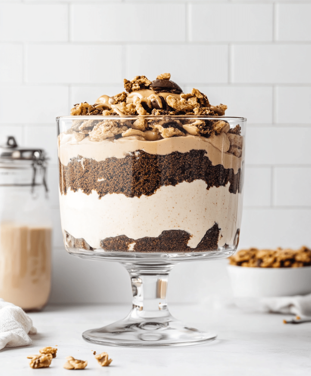 - Top the Trifle: Add whipped cream, chopped mini peanut butter cups, and chocolate shavings or sprinkles on top for garnish.
