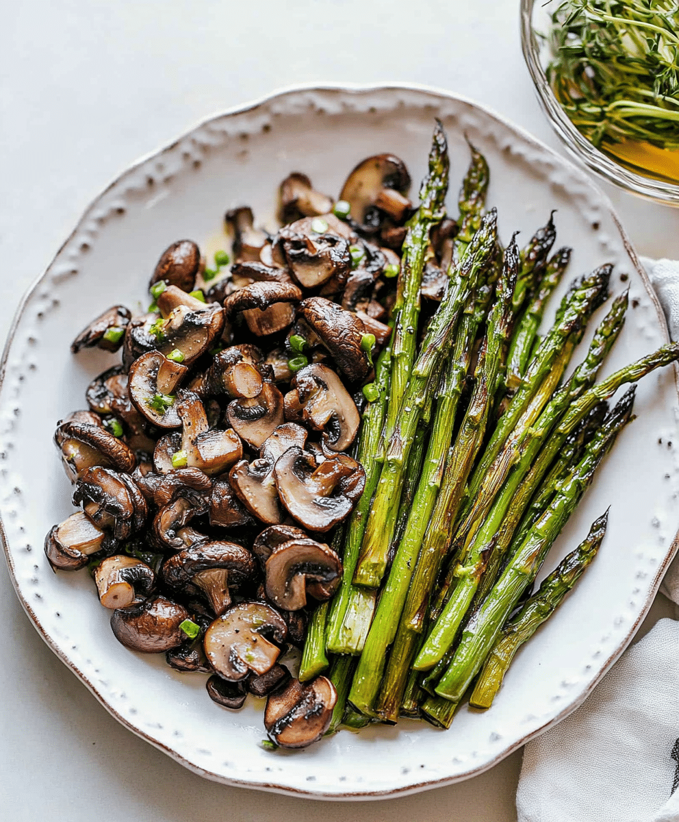 Enjoy a simple, healthy side dish with this Roasted Asparagus and Mushrooms recipe. Fresh asparagus and earthy mushrooms are tossed in olive oil, seasoned, and roasted to perfection. Perfect for a quick weeknight dinner or a holiday meal! Keyword: Roasted Asparagus and Mushrooms recipe.