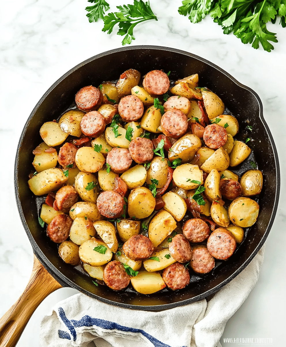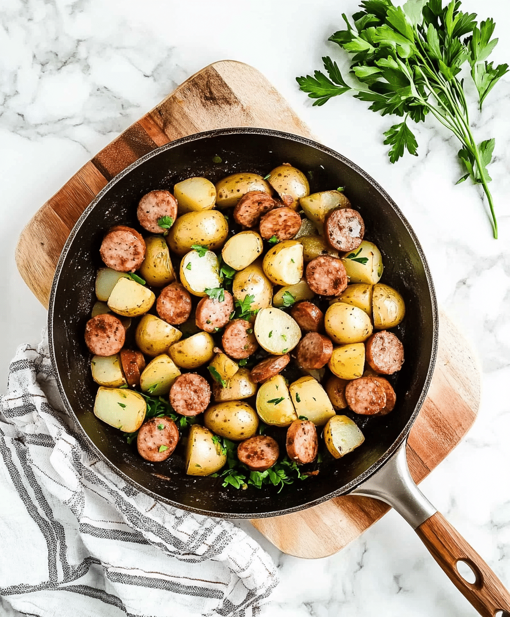 This sausage and potatoes skillet recipe is a simple and satisfying meal made with smoked sausage, tender potatoes, and savory seasoning. Perfect for busy weeknights, this one-pan dish is packed with flavor and ready in under 30 minutes.
