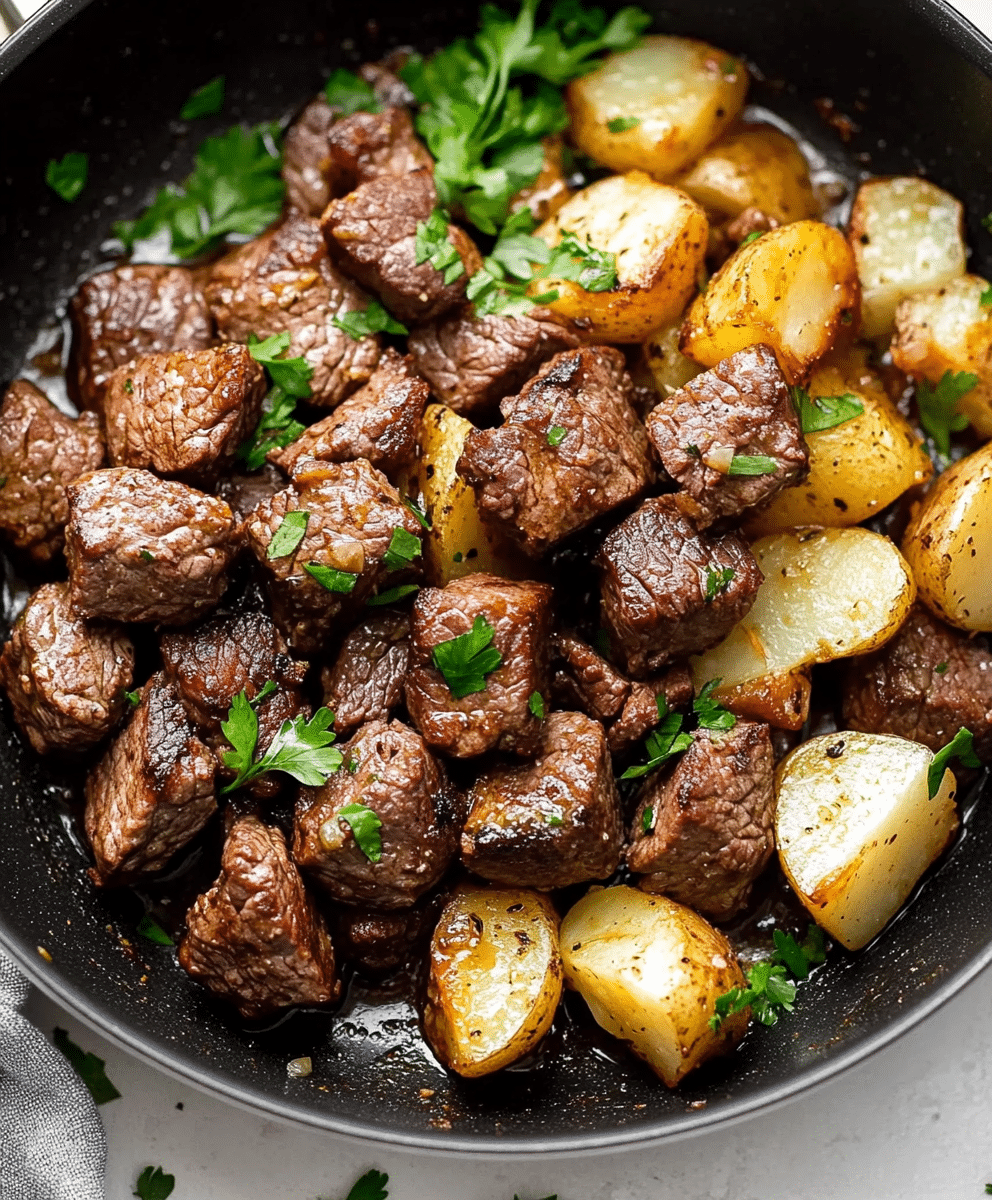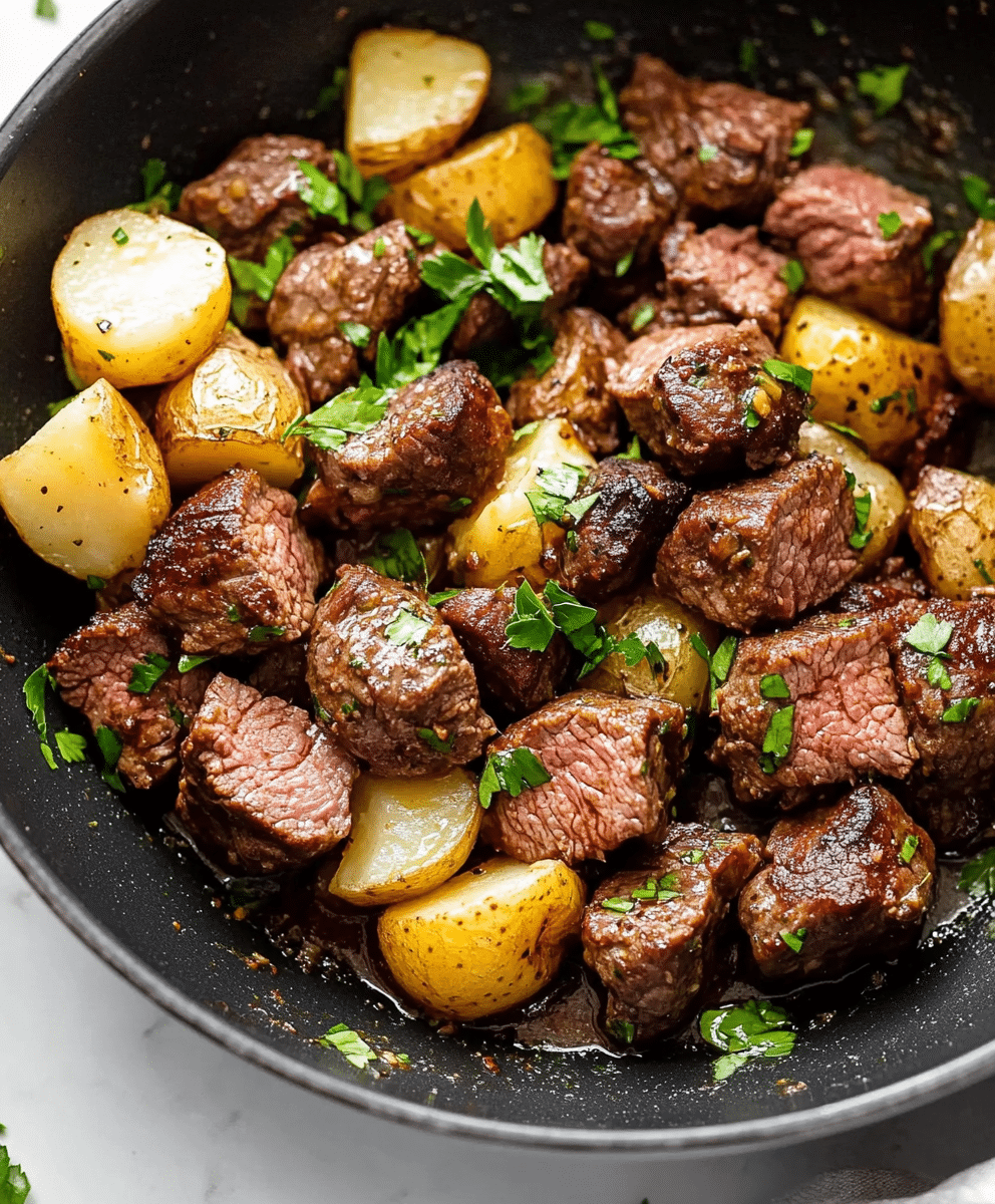 The flavor is out of this world. Garlic butter infuses every bite of beef and potatoes, creating a luxurious sauce that’s both comforting and irresistible.