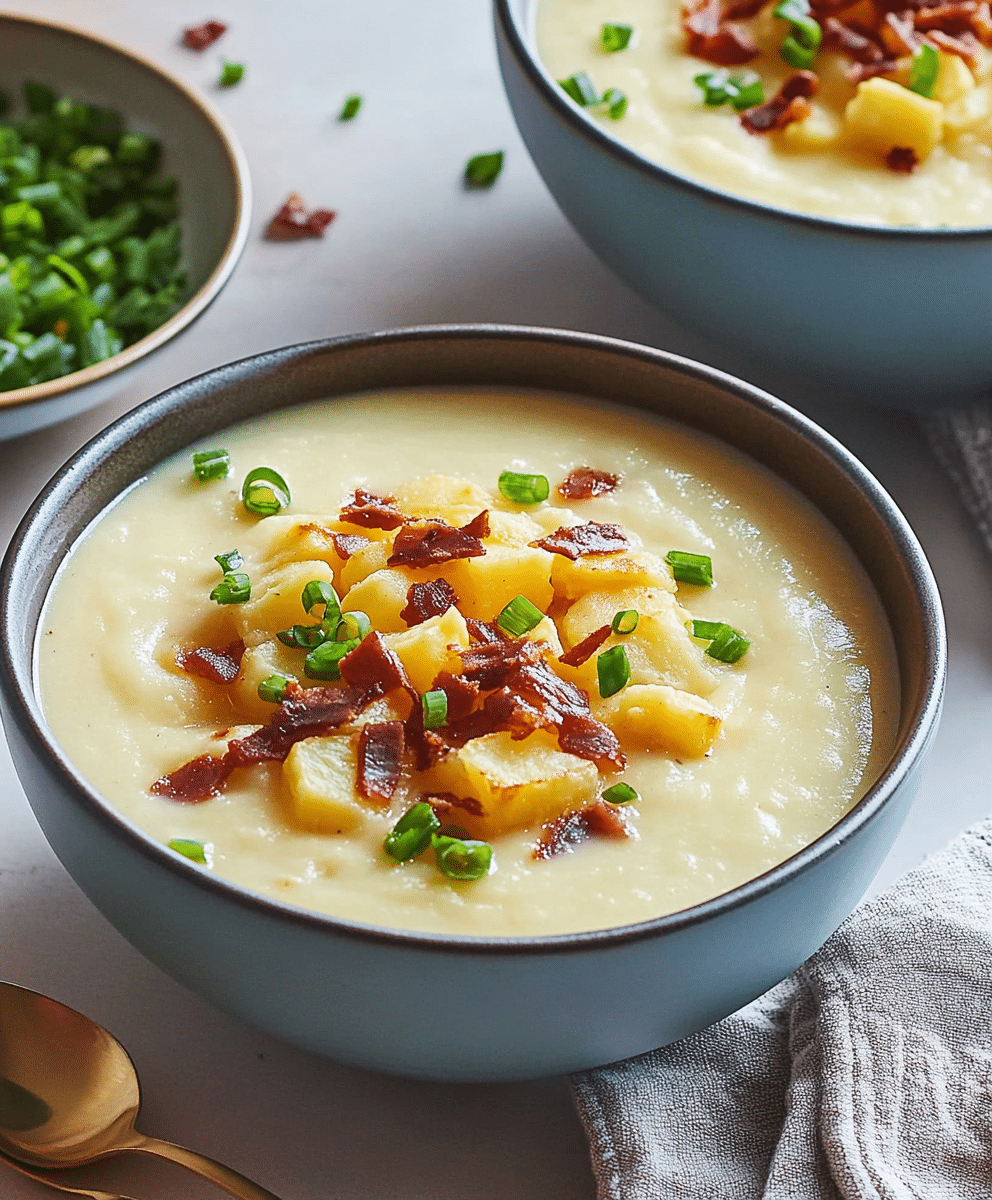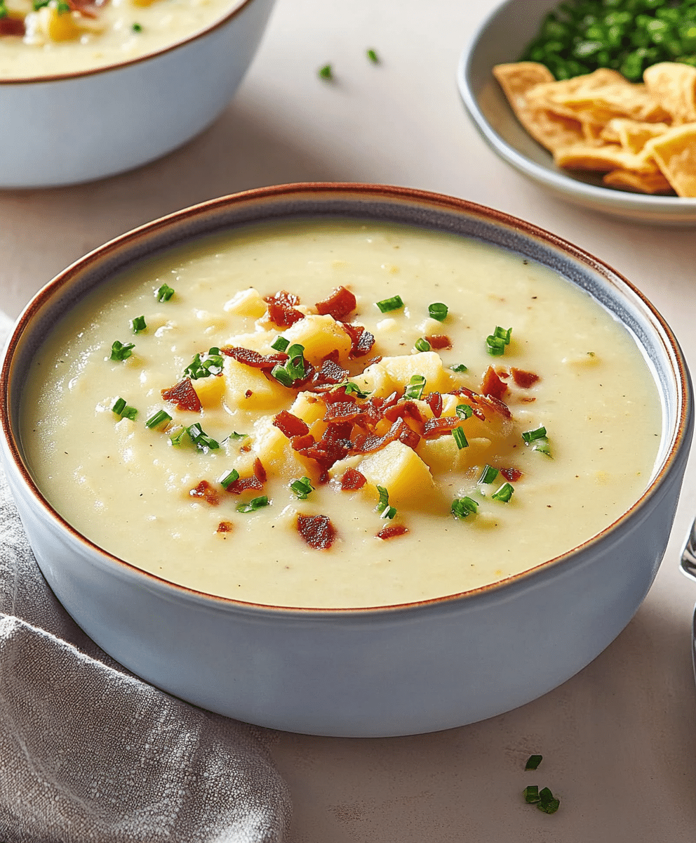 Slow Cooker Loaded Baked Potato Soup is a rich, creamy soup made with tender potatoes, cheese, bacon, and chives. This comforting recipe is easy to make in a slow cooker and perfect for busy days. Top it with your favorite baked potato toppings for extra flavor!