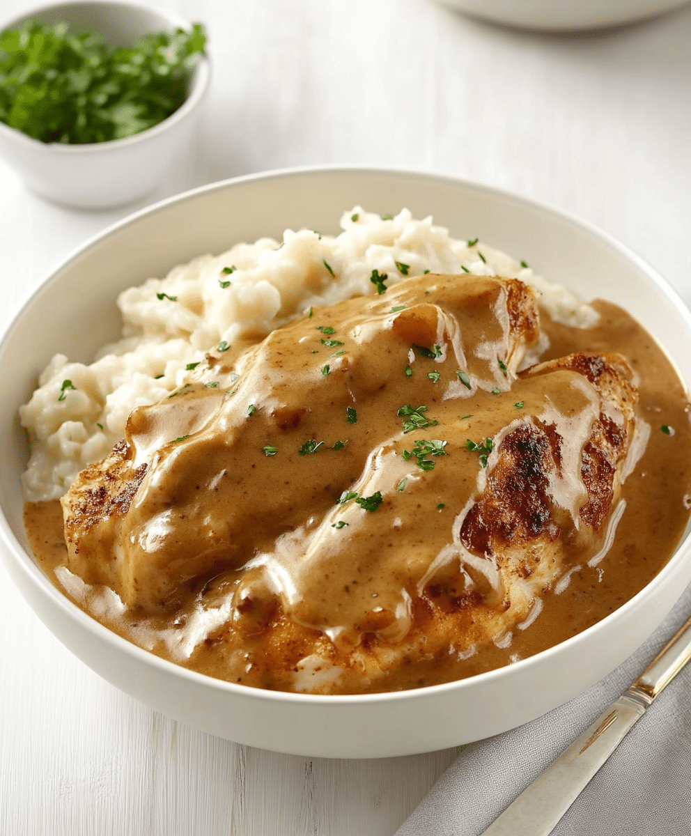 For a beautiful presentation, place each piece of chicken on a plate and spoon the gravy over the top. Sprinkle some freshly chopped herbs like parsley or thyme for a pop of color. You can also add a slice of lemon on the side for a touch of brightness and acidity to balance the richness of the dish.