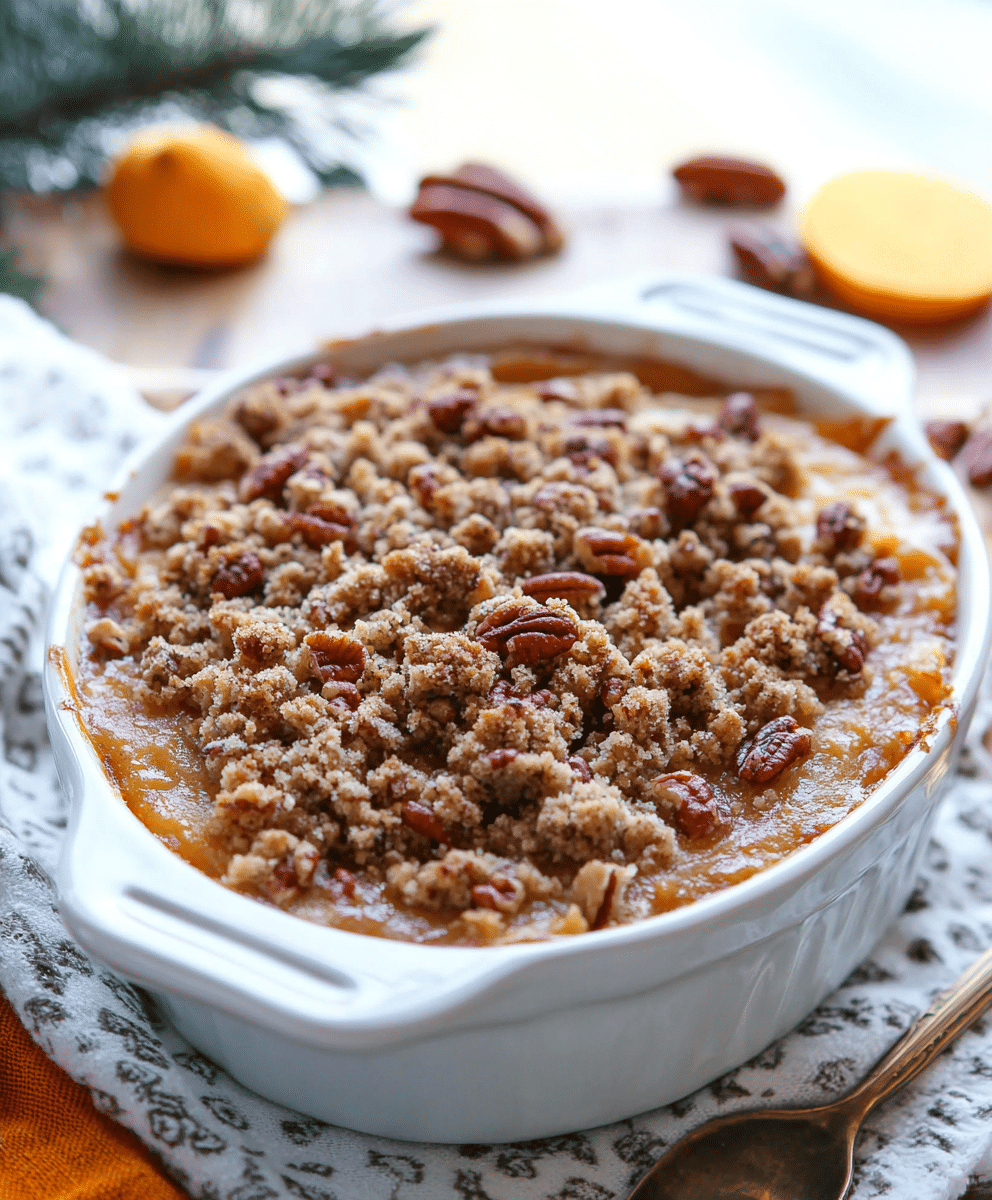 - Sprinkle the pecan crumble evenly over the sweet potato mixture.