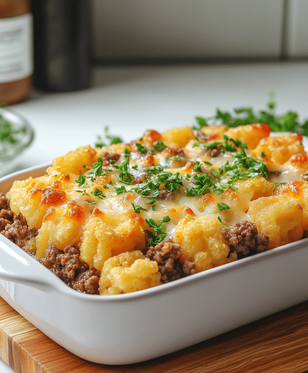 This Tater Tot Casserole with Ground Beef recipe is a family favorite featuring crispy tater tots, seasoned beef, and a creamy cheese topping. Perfect for busy weeknights, this hearty dish uses simple ingredients for a satisfying and comforting meal.