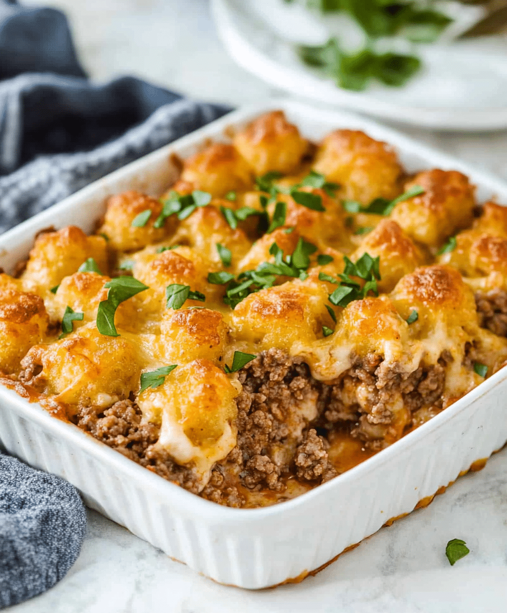 Tater Tot Casserole with Ground Beef is a classic American comfort food dish that combines a hearty ground beef base with crispy, golden tater tots on top. The ground beef is typically seasoned and cooked with onions, garlic, and vegetables, and then mixed with a creamy, flavorful sauce made from condensed soups like cream of mushroom or cream of chicken. It's then topped with shredded cheese and finished with a generous layer of tater tots, which bake to crispy perfection in the oven. The result is a warm, cheesy, crispy-topped casserole that’s as satisfying as it is easy to make.