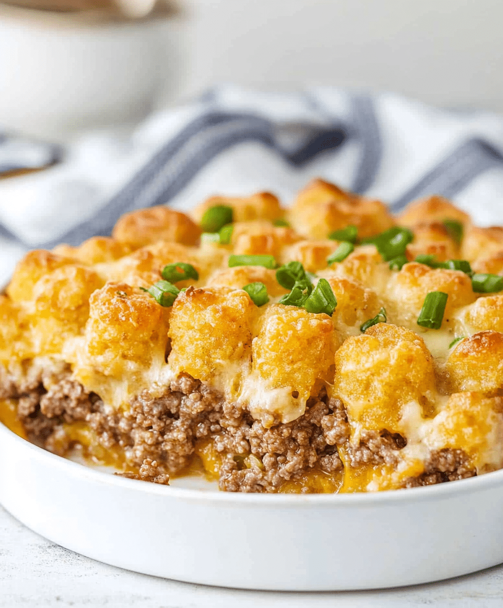 - Layered look: Cut the casserole into neat squares to showcase the layers of beef, cheese, and tater tots.